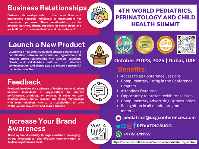 Concept Overview The 4th World Pediatrics, Perinatology, and Child Health Summit, scheduled for October 21-23, 2025 in Dubai, UAE, brings a golden opportunity for researchers, healthcare professionals, academicians, institutions, and industry partners to showcase their expertise and elevate their presence through customized Packages A, B, C, and D. Each package is designed to cater to specific goals — whether you aim to present, promote, or partner with the event at an international scale. Introduction to Packages At the Summit, our exclusive promotional and participation packages allow you to: Package A – Maximize your scientific contribution with premium speaking opportunities and wide branding. Package B – Engage with a broader pediatric, perinatology, and child health audience through poster and workshop visibility. Package C – Highlight your brand via digital and onsite promotions, ensuring your name stays memorable. ...